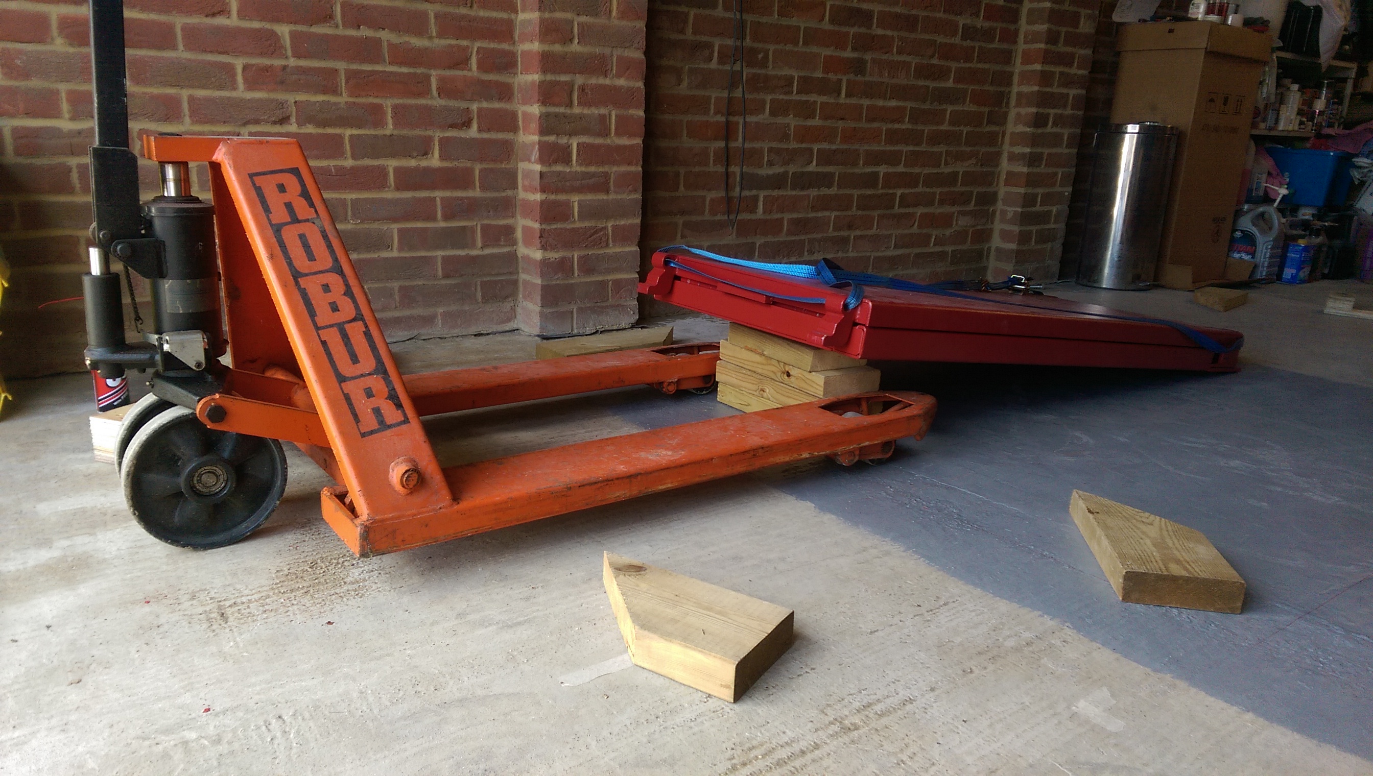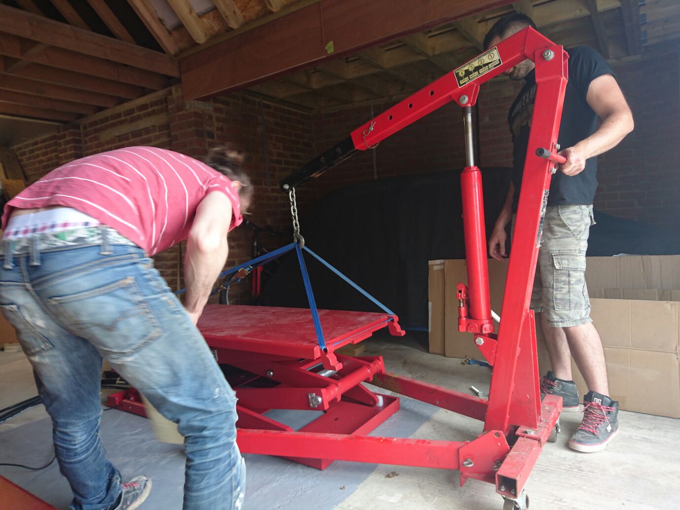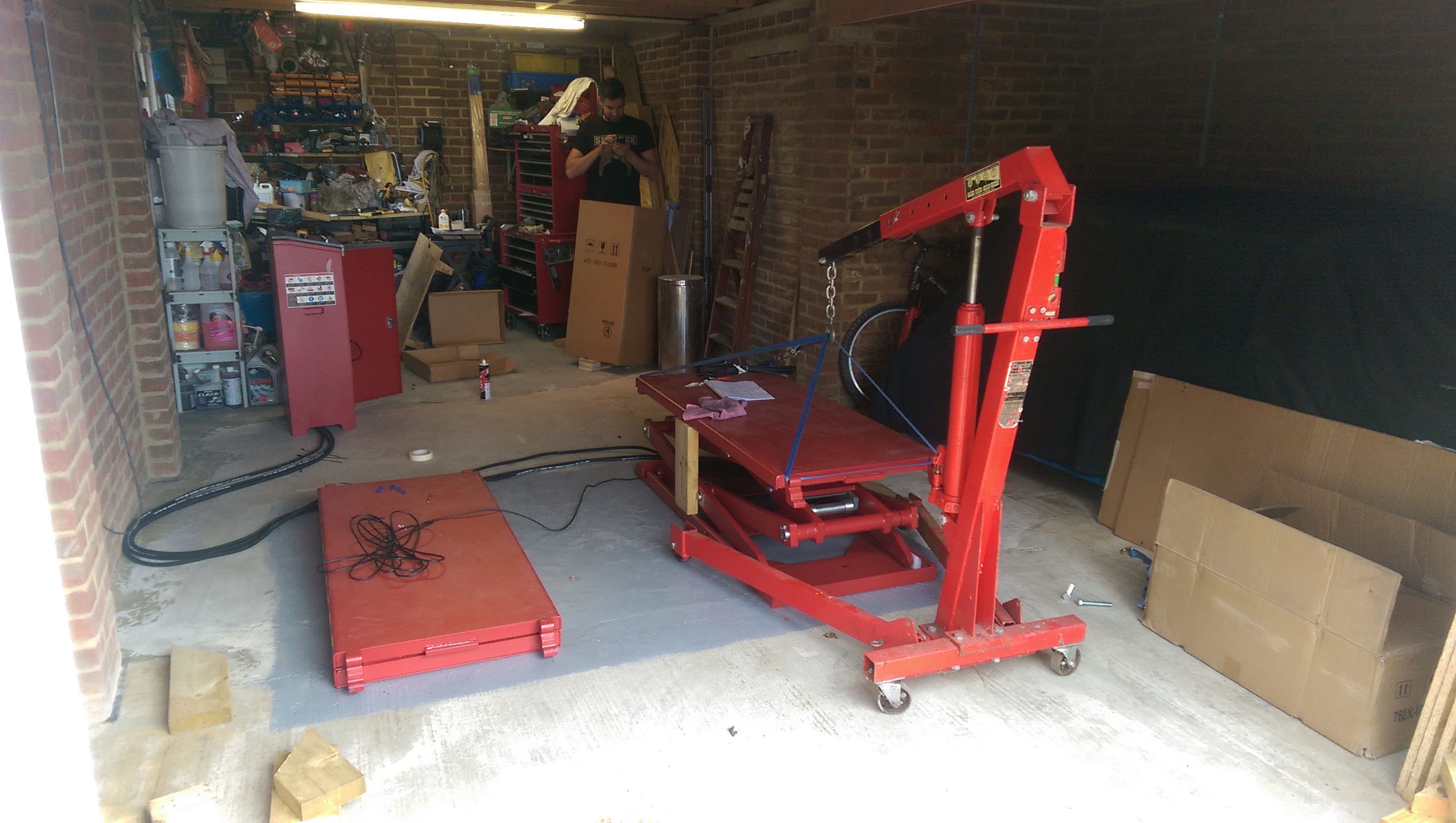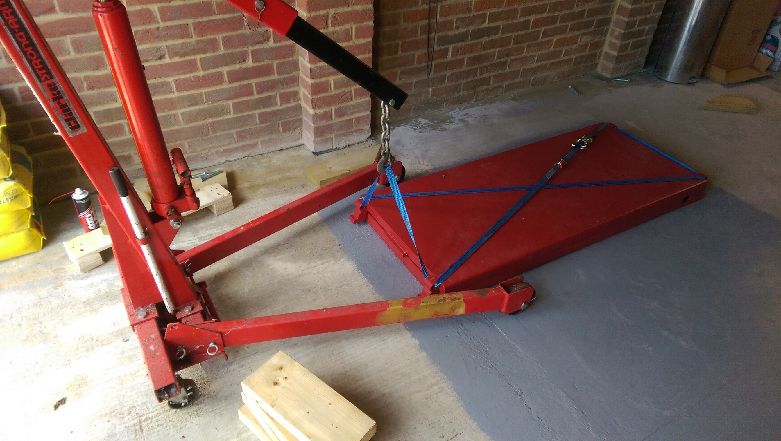 It was necessary to lift the top of the platform to remove the wooden blocks bolted to the bottom for transport and to get at the rams to plumb in the hydraulic hoses. It said in the instruction manual to use a ‘fork car’. With the lack of a fork car or forklift, assuming that is what they meant, we figured my engine crane would do. Note the blocks of wood keeping the top and bottom apart. If this closes down on your fingers then you may as well cancel those piano lessons.